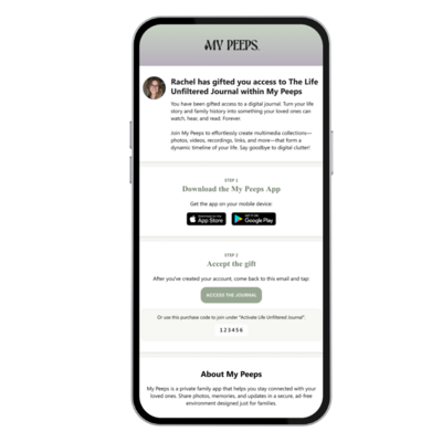 My Peeps the app revolutionizes how you organize and record your memories, life story, and family history with photos, videos, voice recordings, text, hyperlinks, and documents - ensuring what matters most is preserved & private. Not public. Not performative.